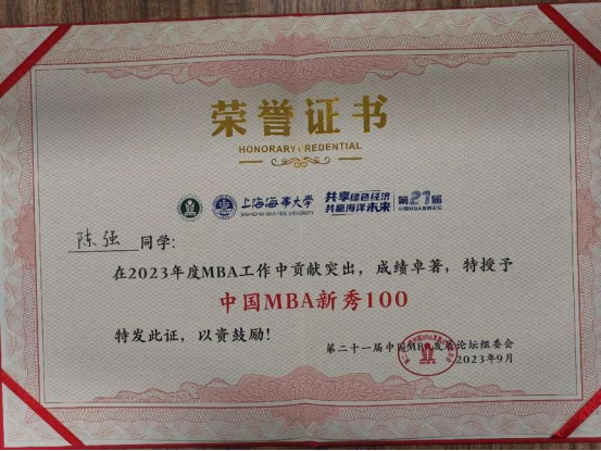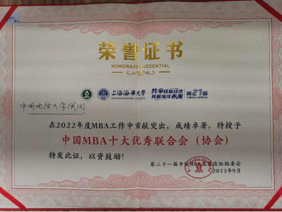 色漫网 专硕联合会喜获“2022年度中国MBA十大优秀联合会”荣誉称号,MBA2018级学生栾相辉获评“中国MBA校友创新创业新星”称号;MBA2021级、地大MBA帆船协会会长周佩佳获评“2022年度中国MBA新秀100”称号;MBA2023级班长陈强获评“2023年度中国MBA新秀100”称号。