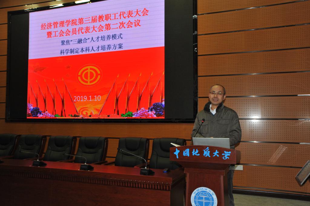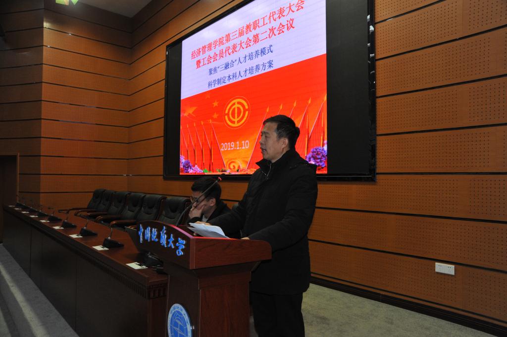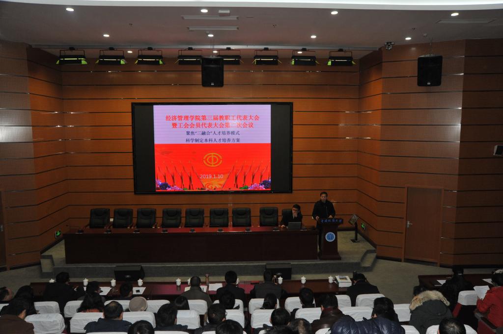 (通讯员周玲,摄影赵谦、王萍)2019年1月10日,经济管理学院第三届教职工全体会议暨代表大会第二次会议在东区综合楼A0113报告厅如期召开。本次大会由包括学院教职工代表在内的全体教职工参加,以“聚焦‘三融合’人才培养模式,科学制定人才培养方案”为主题。 校党委常委、副校长刘勇胜同志、校工会常务副主席喻芒清同志出席会议。