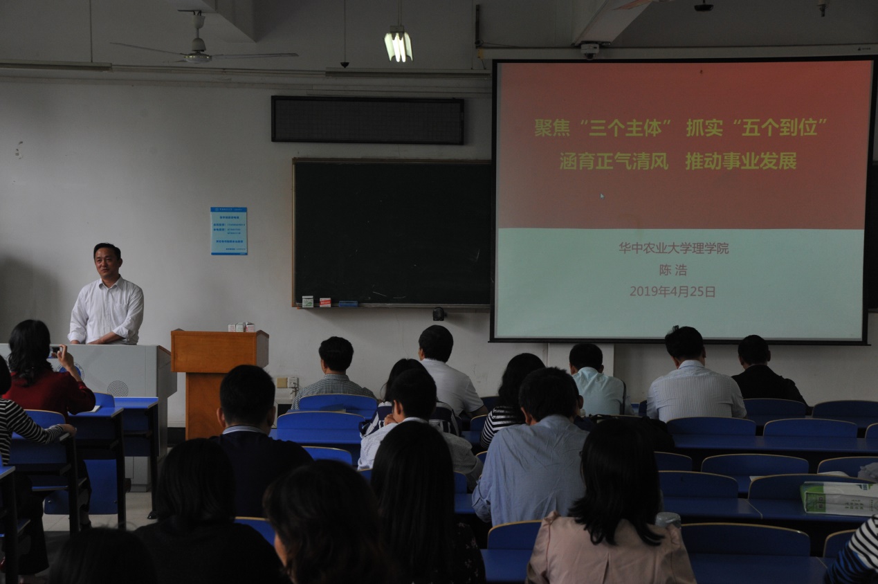 华中农业大学理学院院长陈浩教授结合近年来华农理学院展开的党建工作和获得的成绩,作了以“聚焦‘三个主体’,抓实‘五个到位’,涵育正气清风,推动事业发展”为主题的汇报,向大家分享了高校基层党组织建设中的有益经验和存在不足。他强调基层党建工作要遵循问题导向,理清为何建、如何建、建什么这三个具体问题,在深入分析目前存在不足的前提下,找准党建工作的落脚点。从党委主体责任、支部主体作用和党员主体意识三个方面进行聚焦来分类指导党建工作的开展,确保组织运行机制到位、政治把关作用到位、思想政治工作到位、组织制度执行到位和推动改革发展到位。陈浩教授还就党建工作尚存在的不足之处同到场党员教师进行交流探讨。据悉,华中农业大学理学院党委先后获评湖北省思想政治教育先进集体、湖北省高等学校先进基层党组织,2018年入选全国党建工作标杆院系。