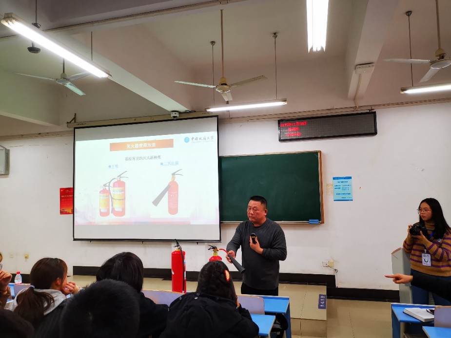 消防科科长周日恒讲解了消防安全知识,具体介绍了现在火灾的特点、近年来校内外发生的火灾类型以及应对措施,向大家展示了学校的灭火器并演示了具体使用方法。