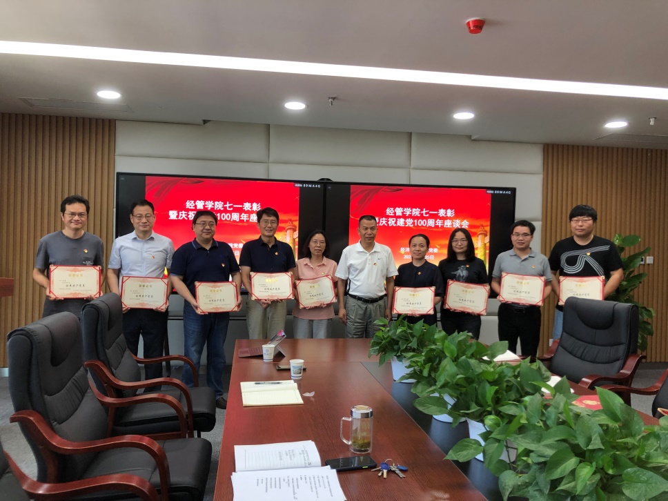在中国共产党成立100周年之际,为表彰先进、学习先进、宣传先进,激励各党支部和广大党员更好发挥政治核心、战斗堡垒作用和先锋模范作用,为扎实推动学院中心工作和全面推进学院各项事业发展新征程提供坚强政治保证、思想保证、组织保证,学院于2021年6月25日在经济管理学院422会议室举行七一表彰暨庆祝建党100周年座谈会。会议由学院党委副书记李少杰同志主持,学院党委书记杨昌锐同志、院长杨树旺同志、各教工党支部书记、以及受表彰的2020-2021年度优秀党员和优秀党务工作者参加会议。