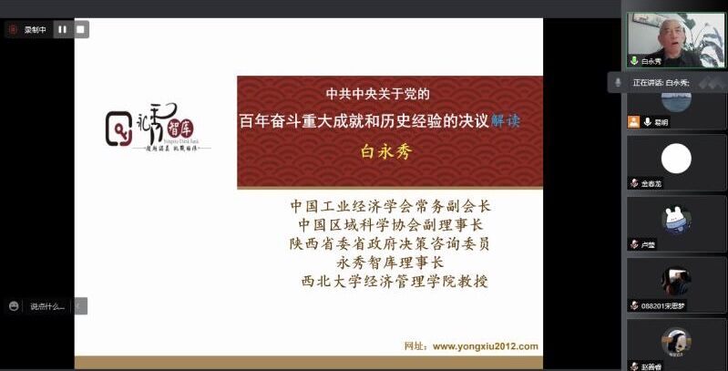 (通讯员 王彦闻)12月2日,应学院金贸系易明教授邀请,中国工业经济学会常务副会长、中国区域科学协会副理事长、陕西省委省政府决策咨询委员、西北大学经济管理学院白永秀教授做客经管论坛并通过网络会议的方式,为色漫网 师生献上了一场精彩的学术报告,论坛主题为党的十九届六中全会解读。