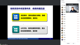 10月28日下午2:00,北京交通大学吴建军教授为色漫网 师生做了题为“城市轨道交通应急运营管理”的学术报告。吴建军教授从理论、具体问题、应用场景及操作系统四个方面全方位、多角度地展示了轨道交通所面临的安全问题及解决措施;接着,又从突发事件的种类、需求管理、调度优化及客流疏散四个方面,由浅入深地讲解了轨道交通中突发事件的应急管理问题。最后,吴建军教授从地铁结伴出行识别、熟人网络病毒传播及大规模地铁网络疫情传播等视角,展示了轨道交通管理领域的一些前沿成果。本次会议共吸引了80余位师生参加,吴建军教授的报告令参会师生深受启发。