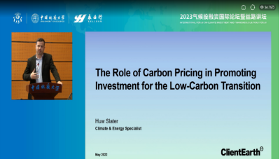 克莱恩斯欧洲环保协会Huw Slater作了主题为《促进低碳转型投资中的碳定价作用》的主旨演讲,他表示气候变化是影响经济转型的重要因素,为此,欧盟制定了绿色协议,积极促进碳市场的发展,使价格机制在低碳转型中能够发挥重要作用。此外,他还分享了欧盟设立绿色创新基金的经验。