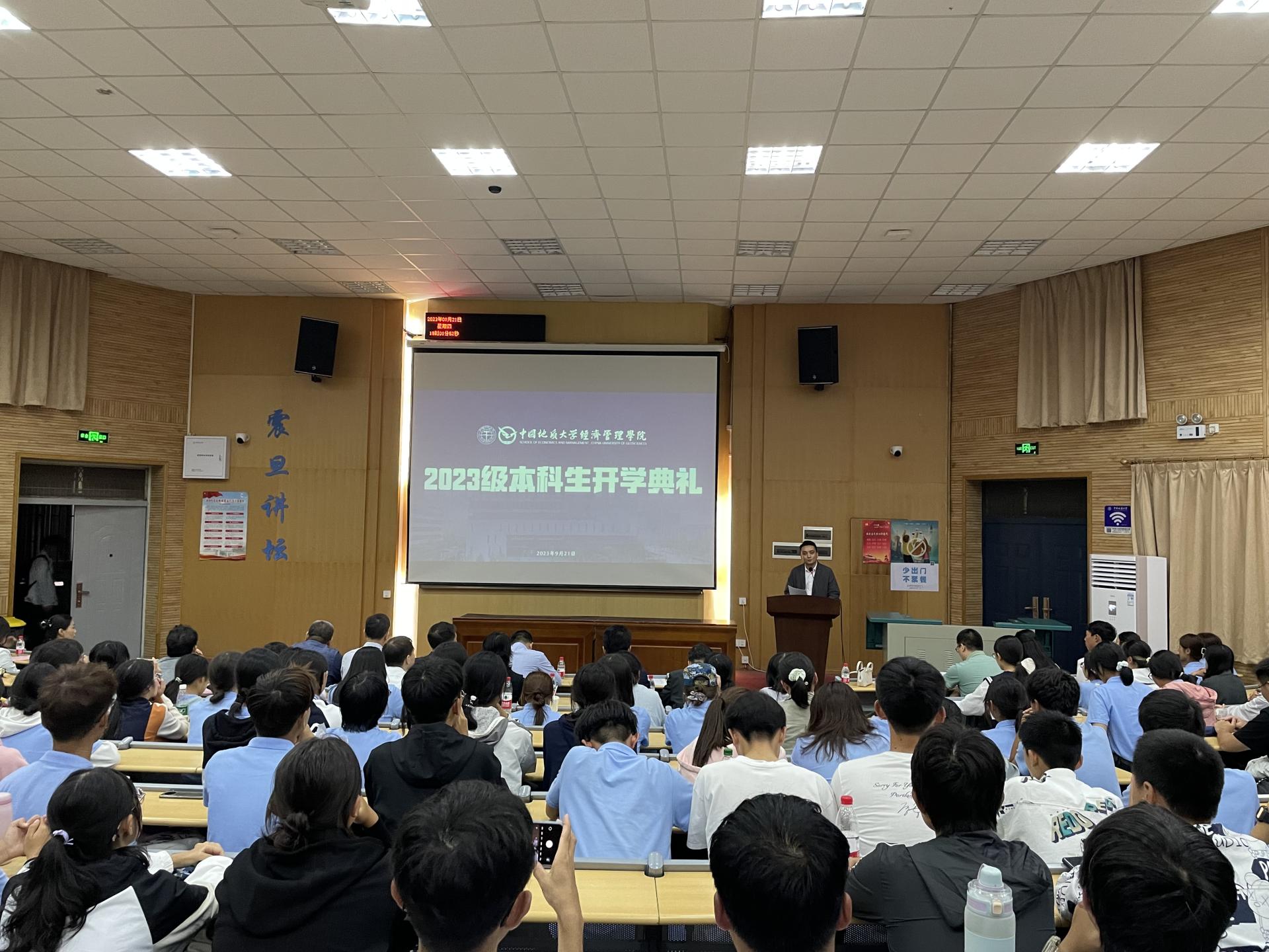 (通讯员 徐媛)9月21日晚,经济管理学院2023级本科生开学典礼在南望山校区西区教三楼109召开。院党委书记杨昌锐,院长於世为,副院长肖建忠、王广民,工商系系主任谢雄标、支部书记张京,经济系系主任刘江宜,会计系系主任杨洁,旅游管理系支部书记李江敏,08S234班班主任侯俊东,088231班班主任江奇胜,08G232班班主任王飞,08G234班班主任柯小玲,教师代表倪琳、石跃勇,辅导员徐媛和2023级全体新生出席开学典礼。典礼由学院团委书记努尔夏提·居勒提主持。