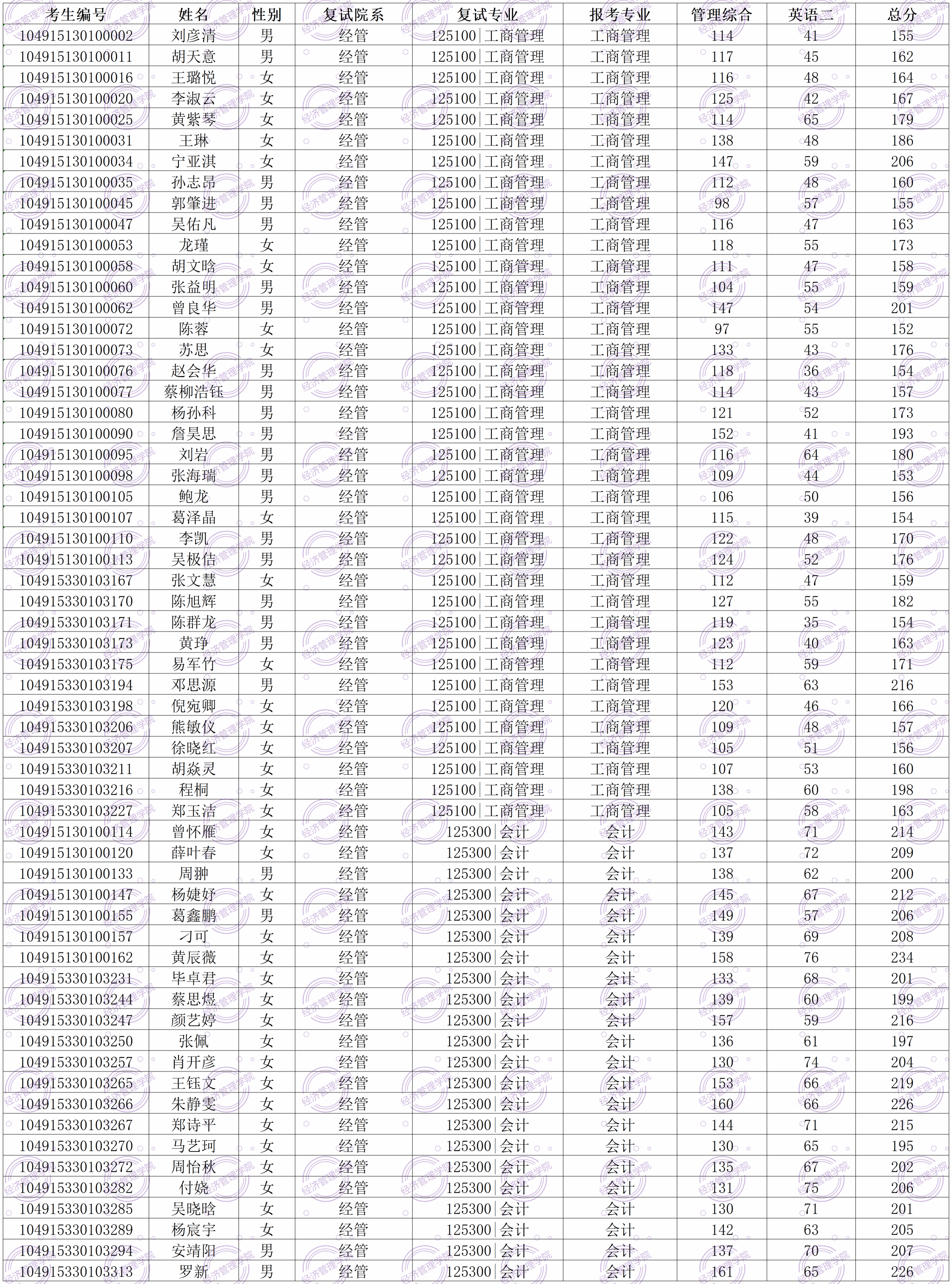 附件一:色漫网 经济管理学院专硕(MBA、MPAcc)复试名单