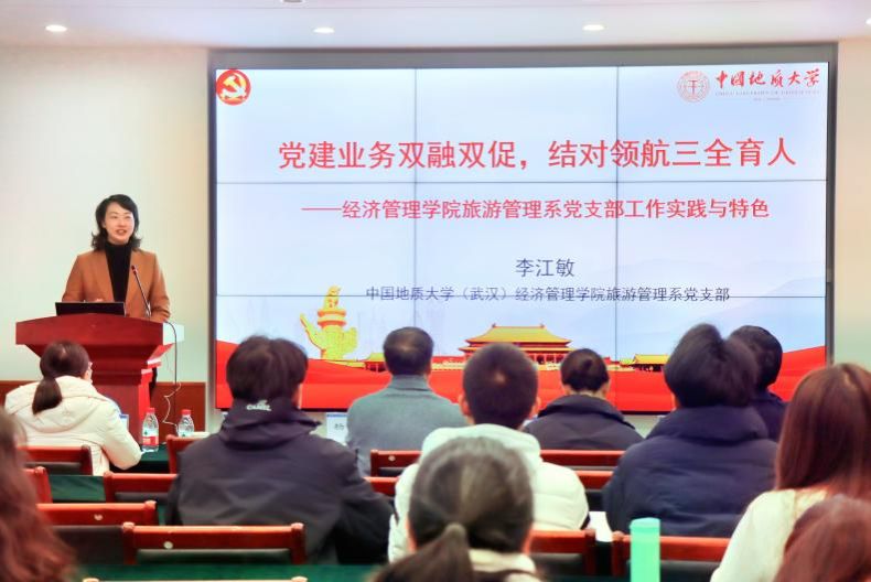 杨昌锐书记围绕《高校党建“双创”工作思考和探索》,介绍了学院党建双创工作经验,并从党组织领导和运行机制力争科学、规范、高效,政治把关力争严格、细致、全面,思想政治工作力争面对面、心贴心、实打实,基层组织制度执行力争规范、严格、精细以及推动事业发展有位、有为、有力等五方面分享经济管理学院党委“五融”工作法以及党建工作机制体制创新经验。李江敏书记基于《党建与业务双融双促,结对领航三全育人》,分享了旅游管理系党支部工作实践与特色,把祖国大好河山融入党课,以场景思政培育学生专业素养,用红色教育资源筑牢青年理想信念,实现“党建+教学科研+结对领航”,联动师生党团聚合力。专题报告获得了与会人员的一致好评,表示对学院和支部党建“双创”有了更深的认识和收获。