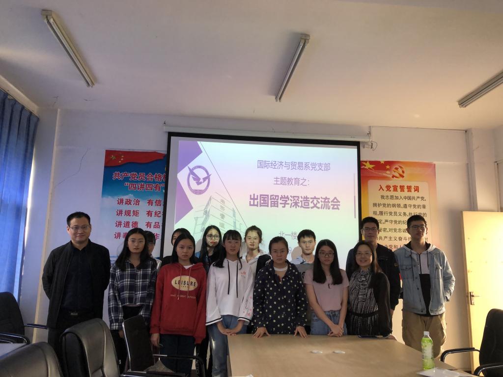 (通讯员:易杏花 苗瑞瑞)2019年10月24日14:00—16:30,经济管理学院国际经济与贸易系党支部在北一楼421室召开了出国留学深造交流会,这既是党支部“结对领航”的一项重要工作内容,也是“不忘初心 牢记使命”主题教育的一个重要环节。活动由国际经济与贸易系党支部书记易杏花主持,系主任白永亮、系副主任洪水峰,国贸系2016级本科生田翔、安浩楠、邓学霖,以及17级——19级有志于出国留学深造的学生参加了本次活动。