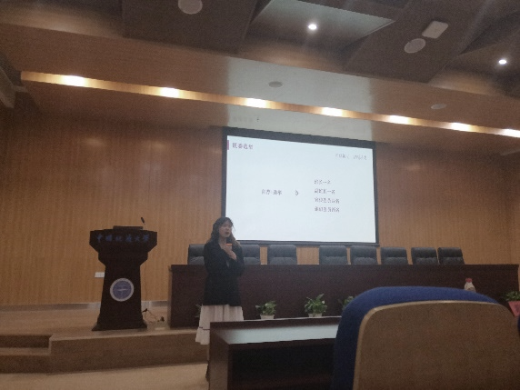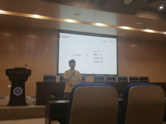第二环节是主席团成员郑雯琪进行团学组织部门介绍。首先,郑雯琪强调了经管学生会是在经管团委的指导下开展工作,大一年级工作组和学生干部储备班为经管团学组织输送人才。其次,郑雯琪依次介绍了经管团学组织各部门的组织架构和部门职能。最后,郑雯琪建议同学们根据自身竞选意向,结合CUG经管新生代的多彩院会推文来加深对经管团学组织的了解。