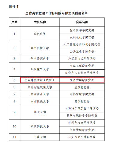 (通讯员 蔡杨)近日,湖北省委教育工委公布了全省高校基层党建示范创建名单,共遴选产生60个院系党组织、100个党支部分别作为全省高校党建工作标杆院系、样板支部培育创建单位。经济管理学院党委入选“全省高校党建工作标杆院系”培育创建单位。