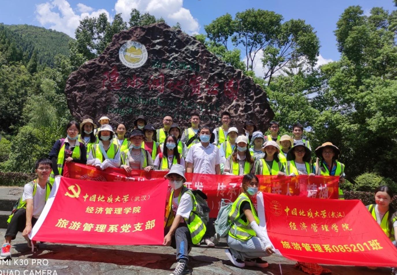 位于地学旅游线上的通山县,其旅游开发对拉动地方经济发展有决定性作用,当地旅游开发建设者同色漫网 (武汉)旅游学人携手开展的地质公园资源勘察、开发规划与公园建设,谱写出共同奋斗、艰苦创业的历史篇章,凝结出旅游“铁人”精神,是认知旅游地学开发、了解旅游扶贫与乡村振兴、认识旅游业及旅游人在社会经济发展中的作用与贡献、学习旅游学人和旅游“铁人”精神的典型案例地,也是旅游管理系党支部开展师生“结对领航”项目的场所之一。本次地学旅游线的实习考察,带队教师联系并邀请到长期参与当地旅游开发建设与管理、通山隐水洞国家地质公园市场部负责人王俊伟经理为同学们做现场教学,在听“旅游故事”中开展了相应思政教学活动。