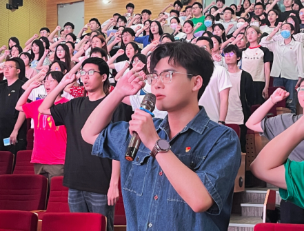 会议伊始,全体党员奏唱国歌并重温入党誓词,工程管理专业本科生党支部学生代表黄志豪领誓。