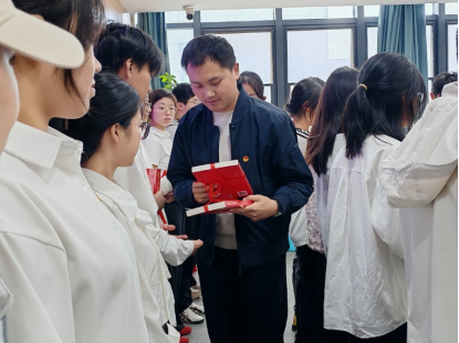 徐媛、张弛代表学院团委向全体新团员赠送了《习近平与大学生朋友们》一书,勉励新团员汲取智慧,练就过硬本领。