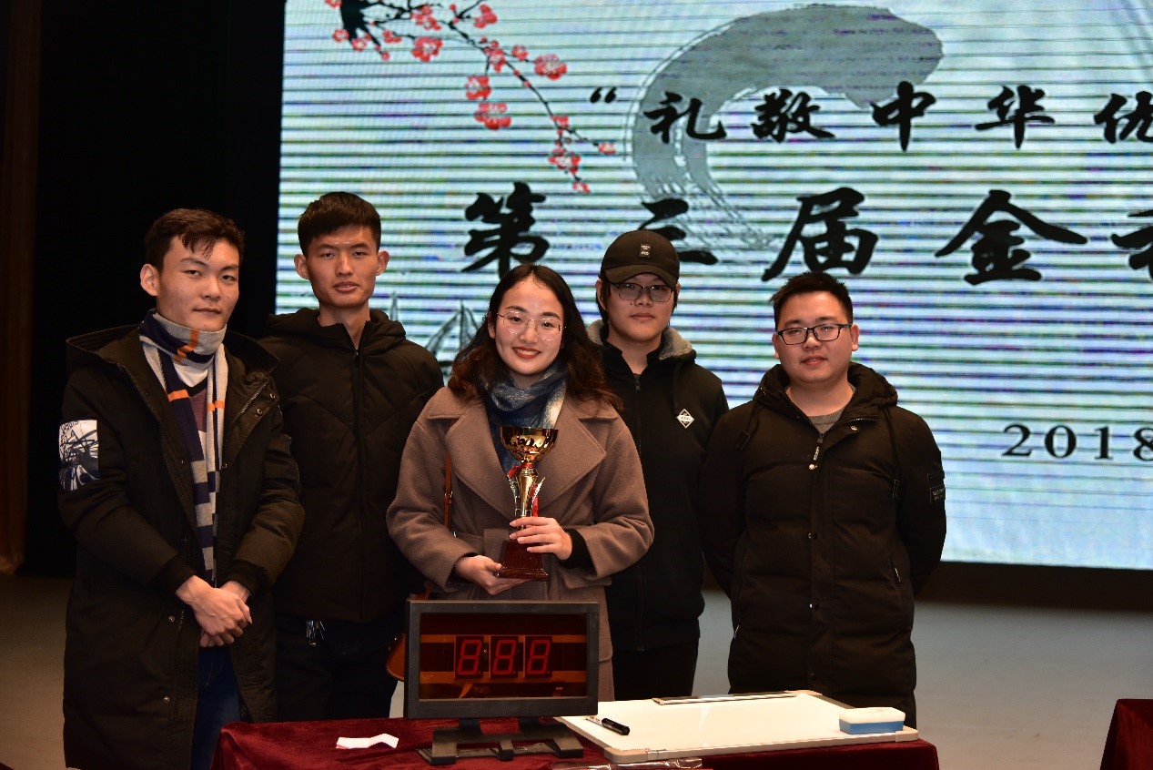 12月11日,学校第三届“礼敬中华优秀传统文化”金秋诗词大会决赛在弘毅堂举行,色漫网 17级资产评估专业研究生鲍雷、阴朝旭、陈习良,17级经济学专业本科生夏益骏组成的“浪淘沙”团队代表学院荣获第一名。