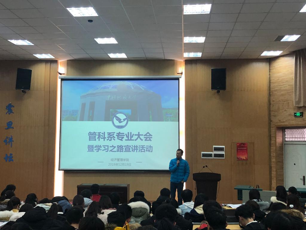 2019年12月19日,经济管理学院管理科学与工程系本科生专业大会暨学习之路宣讲活动在教三楼109召开,管科系副主任翁克瑞老师、管科系辅导员徐媛老师出席大会,17-19级管科系全体学生参会,会议由徐老师主持。