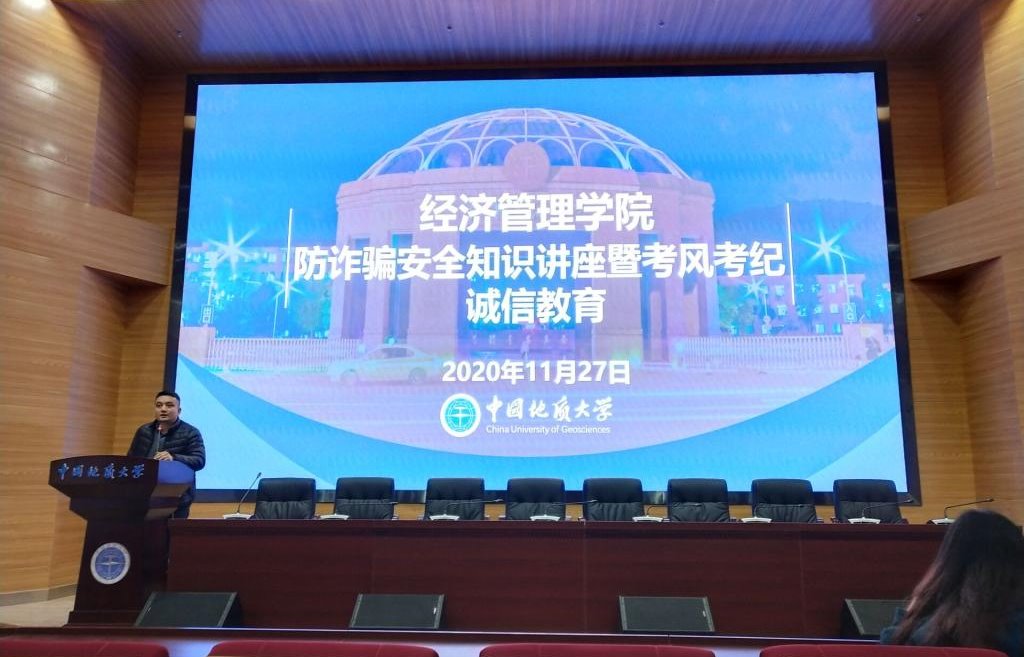 (通讯员:周雨婷/王梦思)2020年11月27日晚,经济管理学院防诈骗安全知识讲座暨考风考纪诚信教育活动在经管学院二楼报告厅顺利开展,由学工组辅导员努尔夏提·居勒提老师主持,工商大类A2018、2019级全体学生线下参会,其他各系各年级学生线上自行学习和交流。