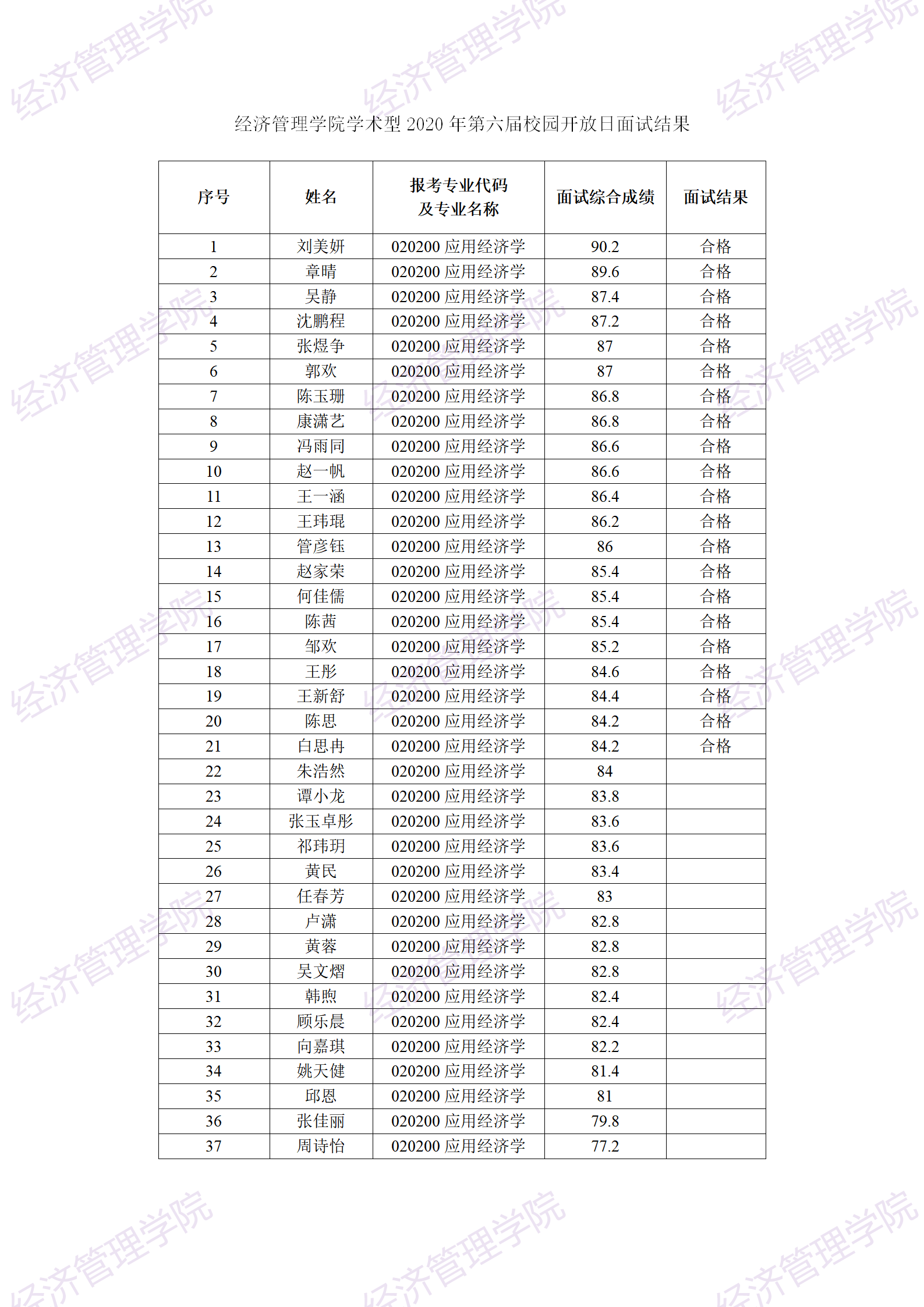 经济管理学院学术型2020年第六届校园开放日面试结果(见附件)现进行公示。公示起止时间为2020年7月17日至7月30日止。公示期内若有异议,请实名书面申诉(限工作日)。联系人:王老师,Email:[email protected]。