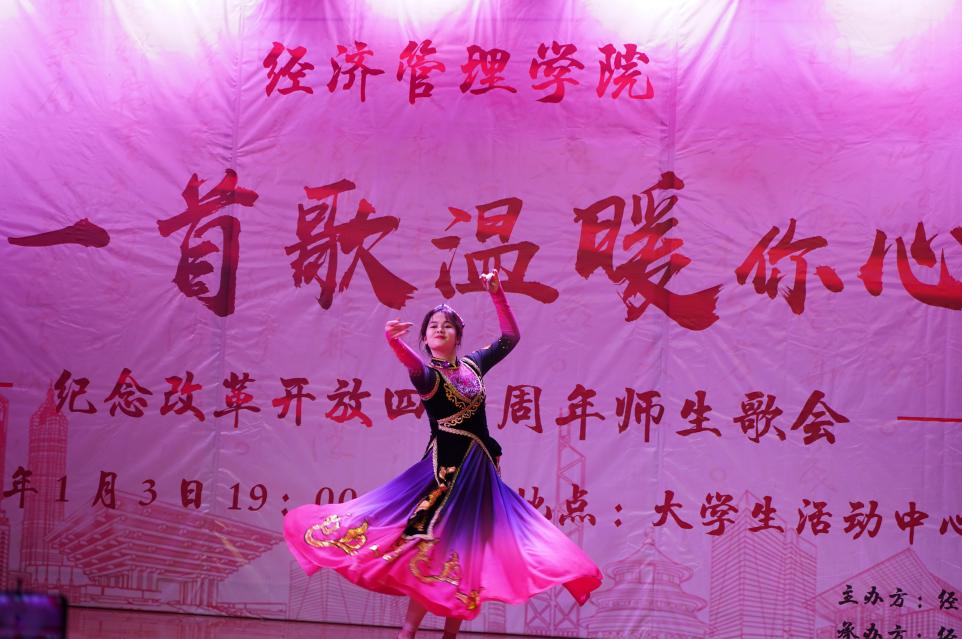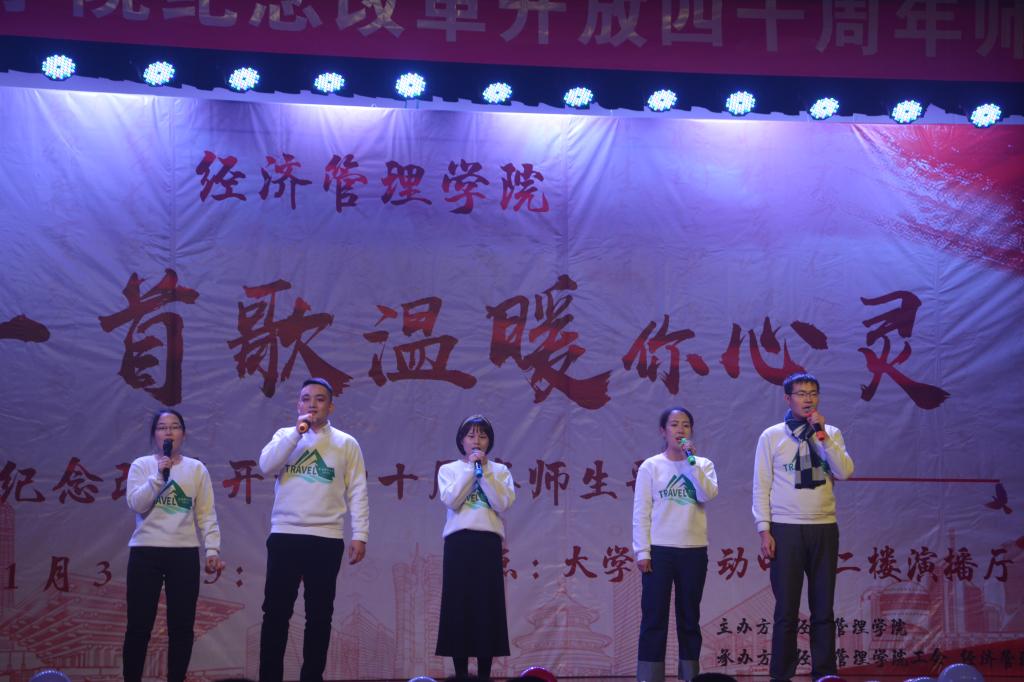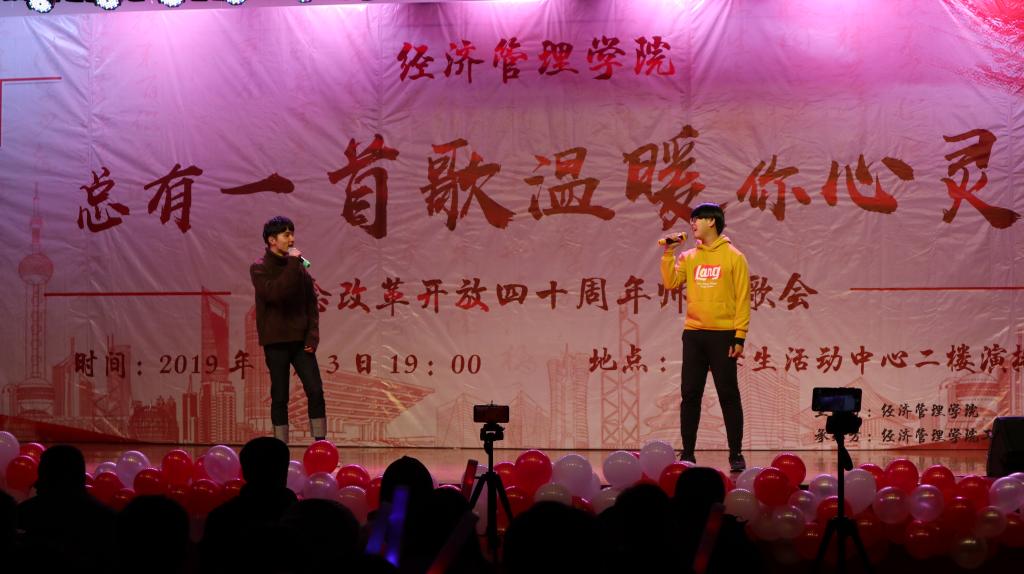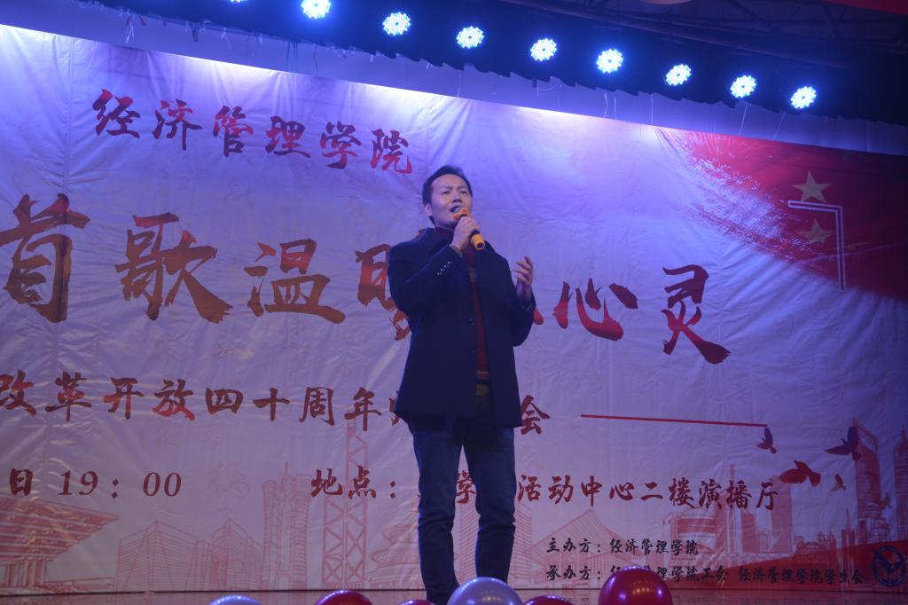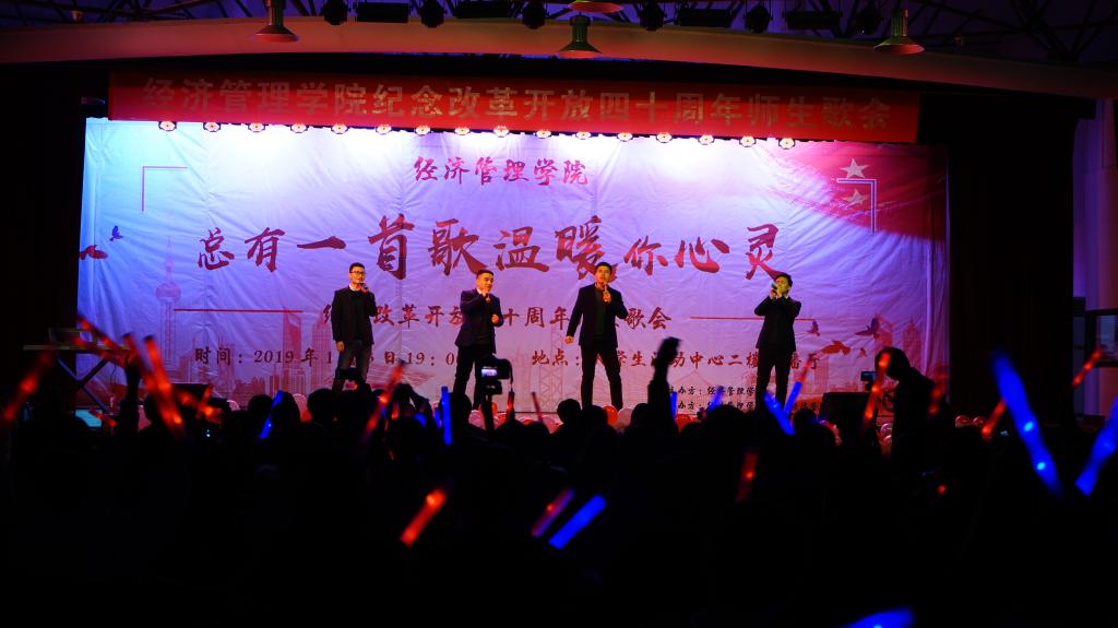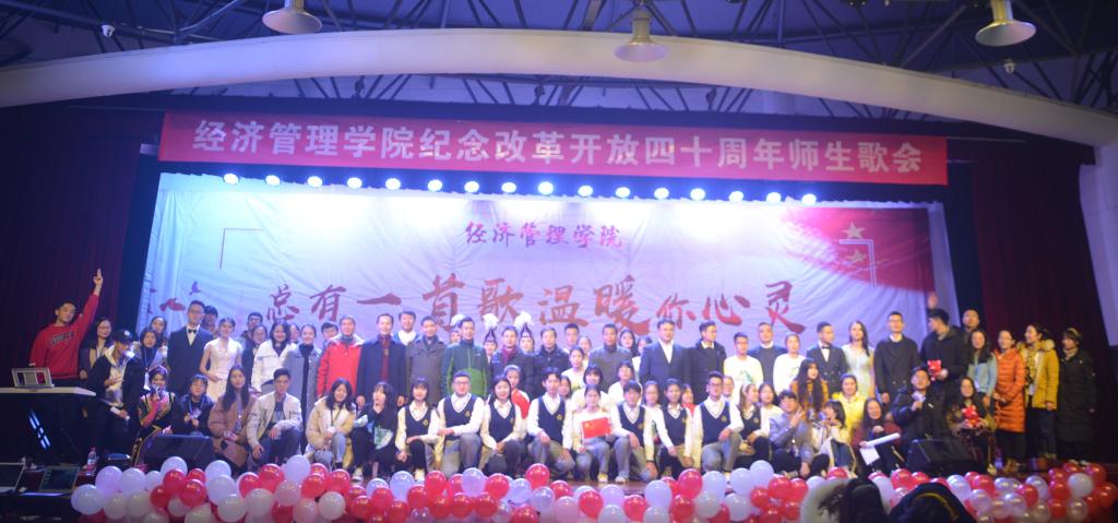 (通讯员:学生曹银凤)2019年1月3日晚7:00,大学生活动中心二楼演播厅灯火辉煌。为纪念改革开放四十周年,经济管理学院举办“总有一首歌温暖你灵”师生歌会。学院党委书记杨昌锐,院长杨树旺,党委副书记沈波,副院长肖建忠,副院长於世为,各系主任、教师,各年级辅导员出席歌会,全体本、研学生到场观看。