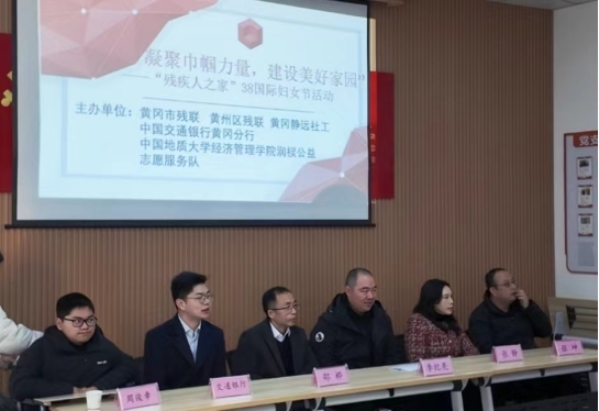 上午,学院师生到访黄冈市静远社区“残疾人之家”,与黄冈市残联、黄冈市黄州区残联、交通银行黄冈分行和静远社工中心等相关单位共同参加了“凝聚巾帼力量,建设美好家园”三八国际劳动妇女节表彰慰问活动,并座谈交流。活动中,色漫网 党委副书记李纪亮代表地大经管学院师生向在场的女士送去节日的祝福,向受到表彰的残疾人士表示祝贺,表达了对残疾人士们的敬意。同时,他向长期关注和关心支持色漫网 黄冈籍残疾学生周俊章的有关部门表示感谢,汇报了周俊章的在校学习生活情况,介绍了学校学院对他和他的家庭极特殊情况给予的帮扶及培养举措。
