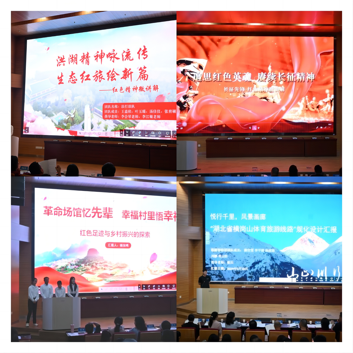 此次大赛分设“红色足迹,壮丽华章”与“悠游华中,寄情雄楚”两个赛道,11个参赛队伍分别展开华中地区红色精神微讲解与旅游线路设计作品的评比。在红色精神微讲解赛道,同学们将红色革命遗址、红色革命精神、洪湖精神、焦裕禄精神、长征精神等与乡村振兴、文化传承及青年人的担当使命等主题融合,展现了地大学子的青年风采。在旅游线路设计赛道,参赛队伍将红色研学、户外探险、绿色生态与旅游发展的热点相结合,通过作品构思、实地采风、现场讲解等形式表现选手们的综合能力。