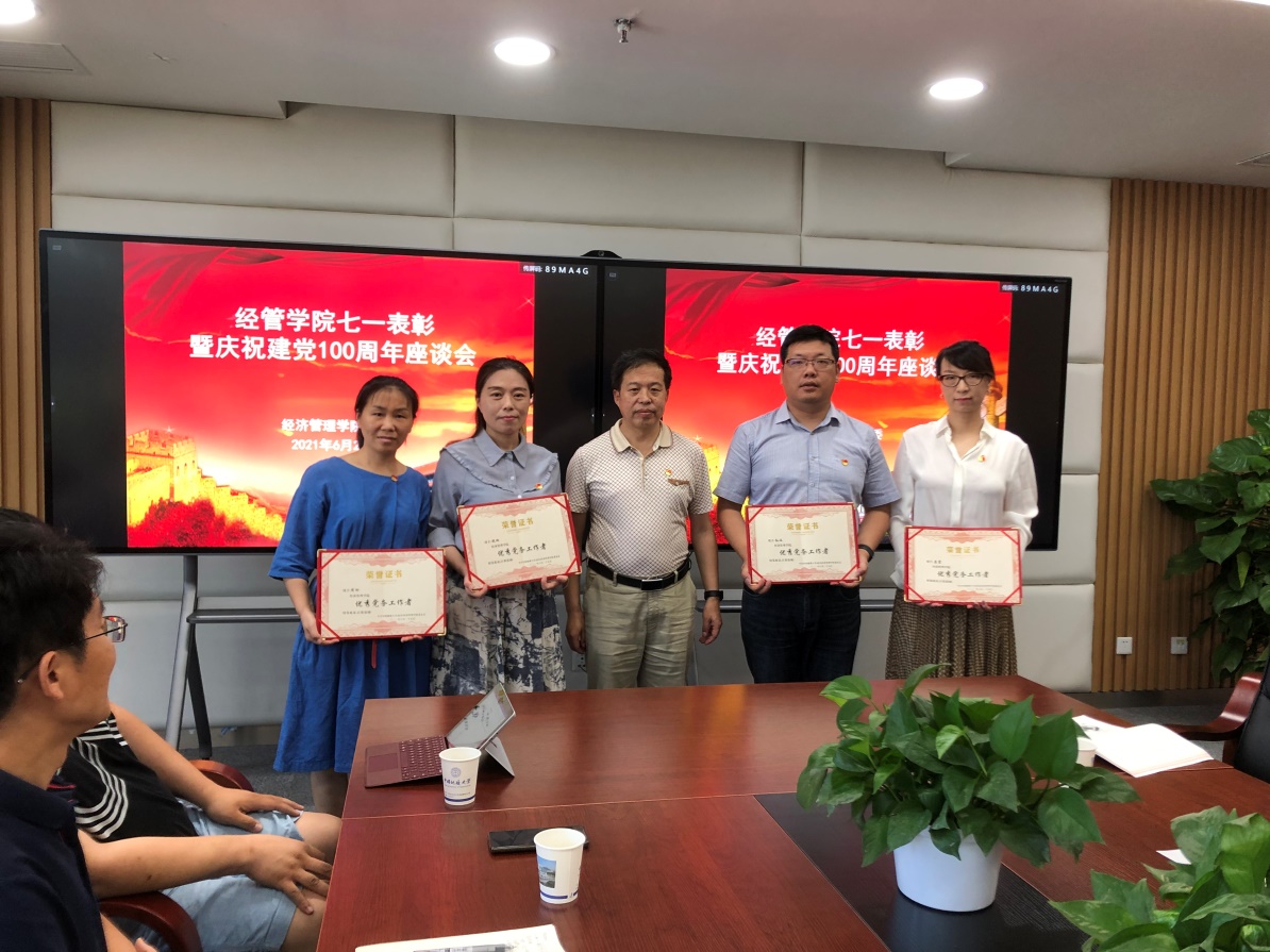 2020-2021年度,经民主推荐评议,旅游管理系教职工党支部、统计学系教职工党支部等2个党支部获得学院“先进基层党组织”称号,白永亮、程欣、邓宏兵、龚承柱、何晨琛、刘晶晶、屈文彬、石磊、石跃勇、王林珠、武剑、肖拥军、谢雄标、严良、杨洁等15位同志获学院“优秀共产党员”称号,孟霞、倪琳、孙涵、王德运、王然、张京、周玲等七位同志获得学院“优秀党务工作者”称号。杨昌锐同志和杨树旺同志分别为受表彰的集体和个人颁发奖状。