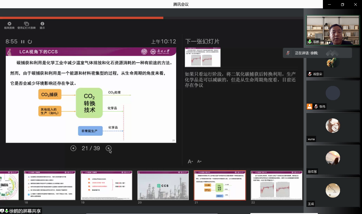 徐教授指出,基于生命周期评价的碳排放主要面临数据、模型、系统边界三方面的挑战,因此,构建符合中国国情、具有代表性、数据质量高、使用方面的本土化数据库以及具有中国地域空间信息特征的本土化生命周期评价模型,扩大研究边界,增加“从坟墓到大门”和“从摇篮到大门”的对比研究是非常有必要的。最后,徐鹤教授以碳中和为切入点,提出了生命周期评价助力碳中和的几点建议:(1)从生命周期评价的视角进行全产业减碳;(2)评价一项新的技术,要从生命周期评价的角度去评价;(3)通过生命周期评价分析不同利益相关者的的行为对全产业链的环境影响;(4)各行业应尽量提供在系统边界、功能单位上可进行对比分析的生命周期评价方案;(5)提倡各行业引入基于生命周期评价的碳核算方法;(6)在提倡碳中和与固废资源化的背景下,延伸系统边界。学术报告结束后,参会者围绕生命周期评价向徐鹤教授提出了相关问题。徐鹤教授结合自己的研究体会耐心回答了这些问题,参会者表示很有收获。