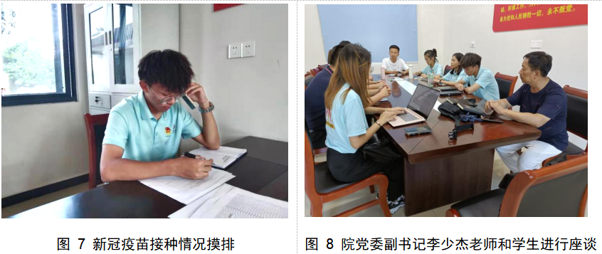 此外,实践团成员更作为村长助理,积极投身到乡村基层工作当中。团队成员协助村委会撰写宣传稿,构建村级宣传平台,让村委思想宣传工作走到老百姓身边。为保障村民身体健康和生命安全,实践团成员还“化身”疫苗接种评估调查员,配合村委会摸排村民新冠疫苗接种情况,细心询问村民疫苗接种后身体状况,积极宣传国家疫苗接种政策。实践团同学张恒恒在参加乡村基层工作后说到:“乡村基层工作是琐碎繁杂的、更是平凡而伟大的,看到村干部对村子的发展成就如数家珍、难掩自豪之情,我更加深切的感觉到什么是担当与奉献,也更明白人生价值的深厚内涵。”