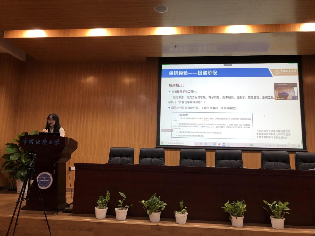 在分享环节,首先分享保研经验的是李佩同学和钱丽瑾同学。李佩同学一直以来都以保送研究生作为自己的学习目标,钱丽瑾同学则是本来以考研为目标最后意外保研。两名同学结合自身的经历,从保研择校、保研面试、保研春夏令营的参加等的注意事项为同学们分享了自己的经验和心得。