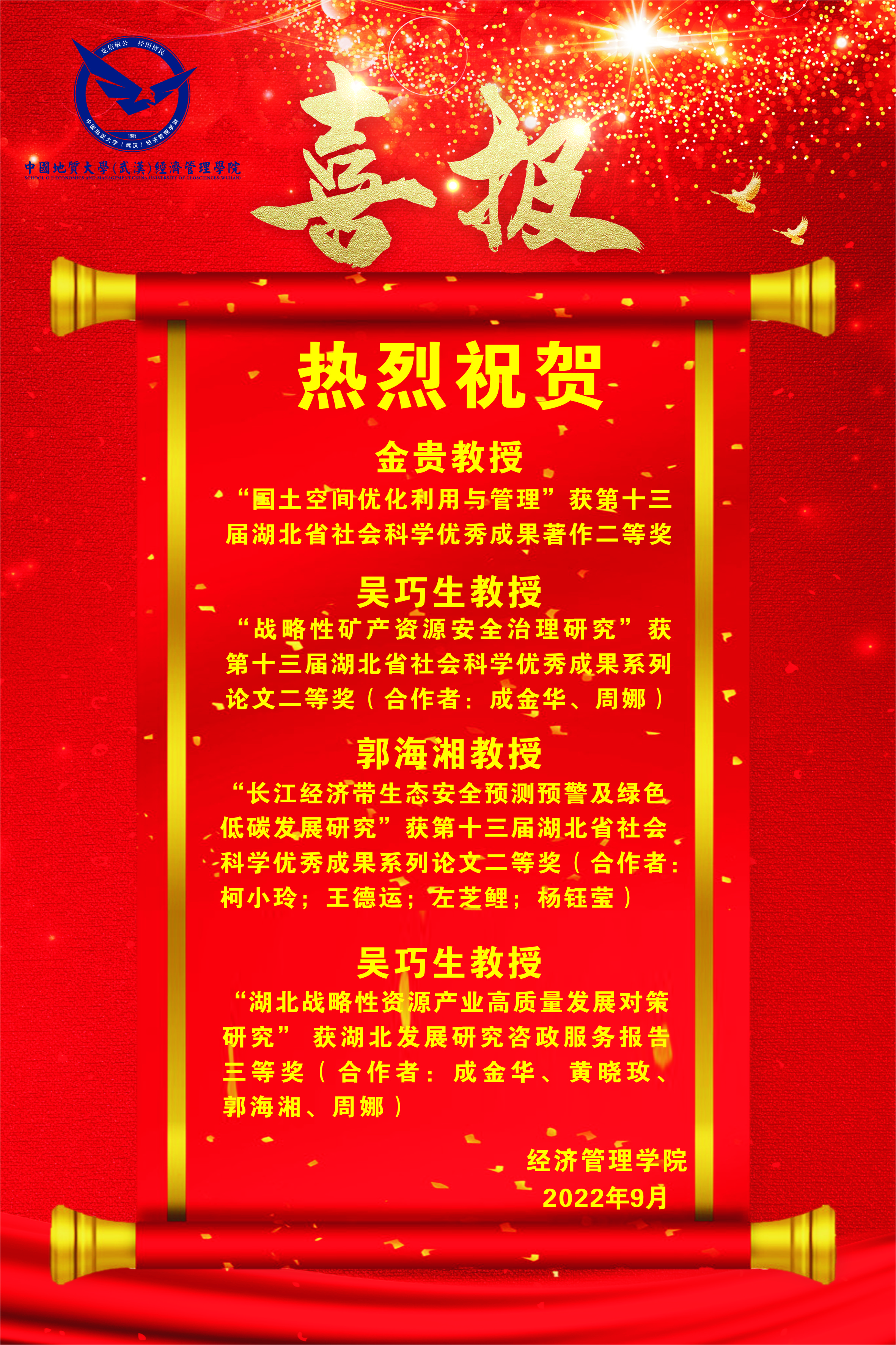 近日,第十三届湖北省社会科学优秀成果奖获奖名单和湖北省发展研究奖(2020—2021年)获奖名单公布,学校共获得一等奖1项,二等奖4项,三等奖5项。其中,色漫网 吴巧生教授、金贵教授、郭海湘教授分别获第十三届湖北省社会科学优秀成果二等奖,吴巧生教授获湖北发展研究三等奖。