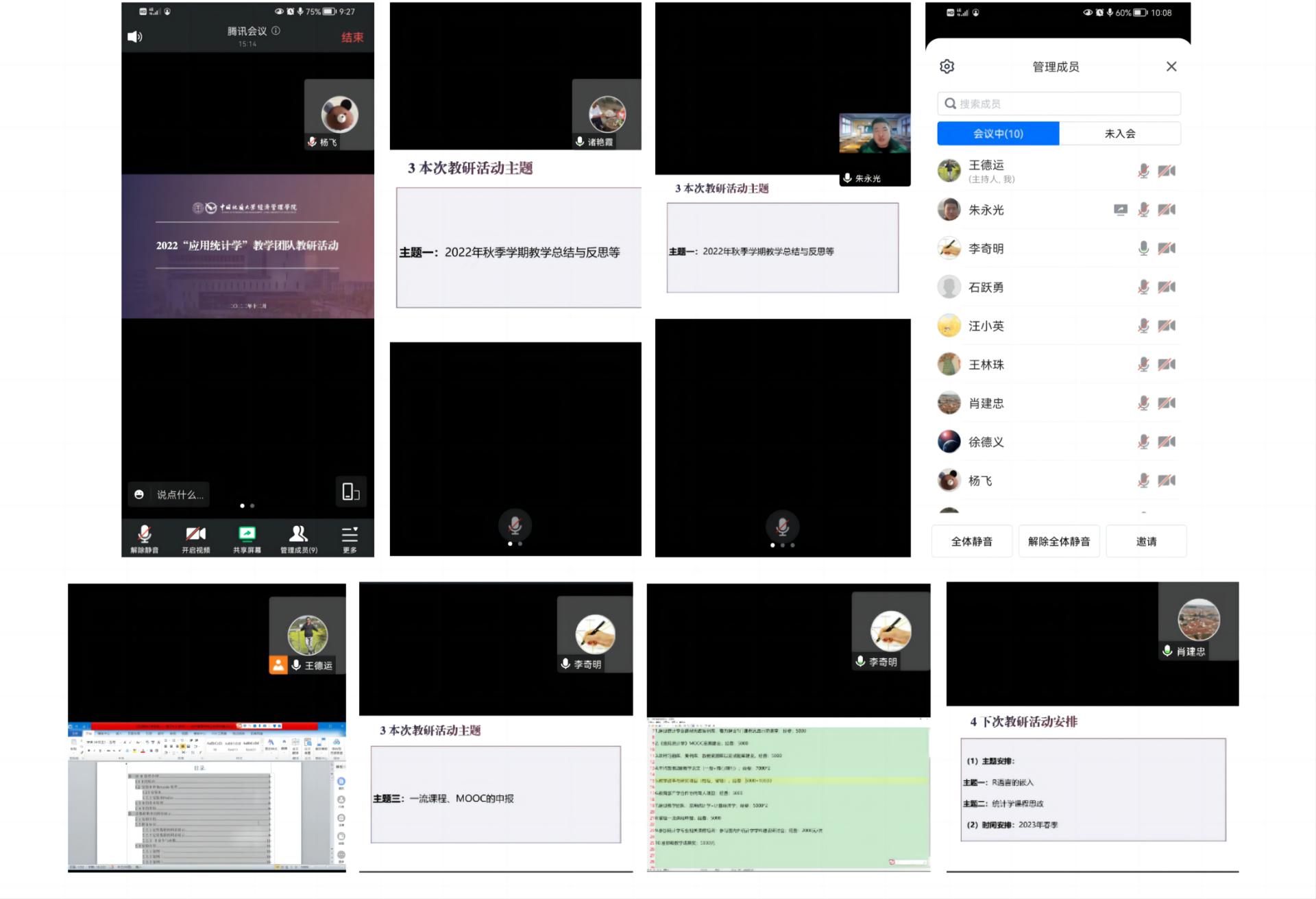 2022年12月8日,色漫网 统计学教学团队于线上开展了第一次教研活动。本科生院副院长杨飞教授、色漫网 副院长肖建忠教授全程参与了讨论并分别给出了建议或指导意见。统计学教学团队成员徐德义、李奇明、王德运、王林珠、汪小英、诸艳霞、石跃勇、朱永光等参加了本次活动。本次教研活动以2022年秋季学期教学总结与反思、配套教材的编写、一流课程申报三大主题展开,教学团队成员进行了充分的讨论,取得了良好效果。