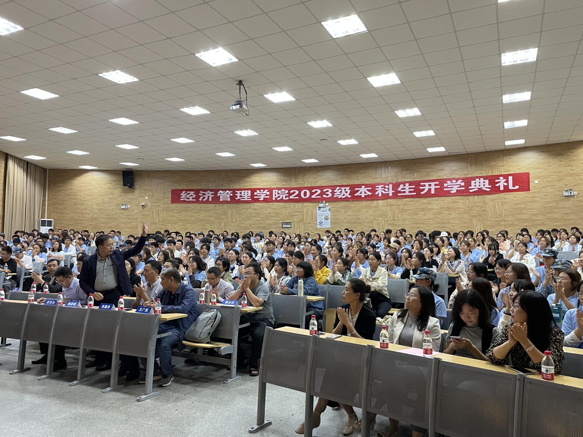 (通讯员 徐媛)9月21日晚,经济管理学院2023级本科生开学典礼在南望山校区西区教三楼109召开。院党委书记杨昌锐,院长於世为,副院长肖建忠、王广民,工商系系主任谢雄标、支部书记张京,经济系系主任刘江宜,会计系系主任杨洁,旅游管理系支部书记李江敏,08S234班班主任侯俊东,088231班班主任江奇胜,08G232班班主任王飞,08G234班班主任柯小玲,教师代表倪琳、石跃勇,辅导员徐媛和2023级全体新生出席开学典礼。典礼由学院团委书记努尔夏提·居勒提主持。