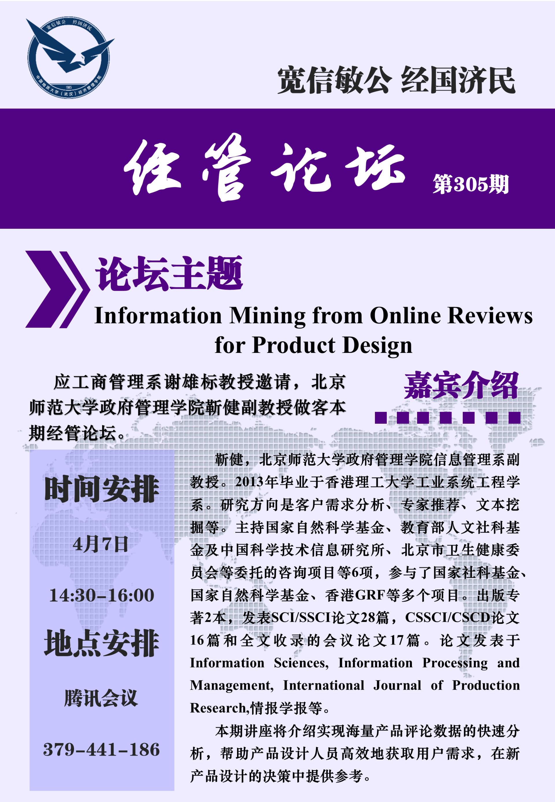 经管论坛(第305期)Information Mining from Online Reviews for Product Design