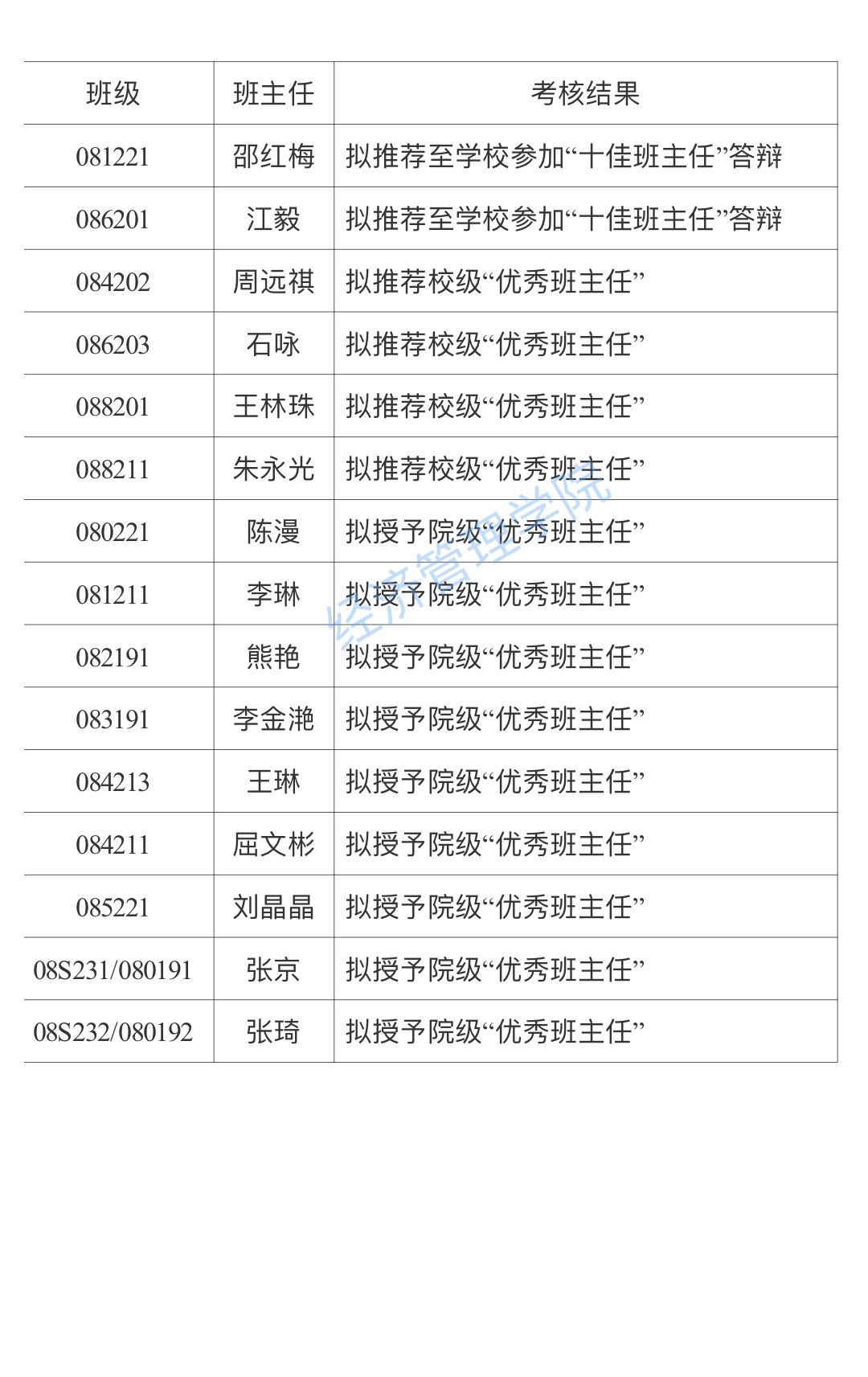 根据《关于开展经济管理学院班主任工作考核的通知》相关要求,学院对全院2019级-2023级所有本科生班级所聘任的班主任进行了年度工作考核,经班主任自评、学生满意度测评及学院评审。现将考核优秀名单公示如下(按班级序号排序):