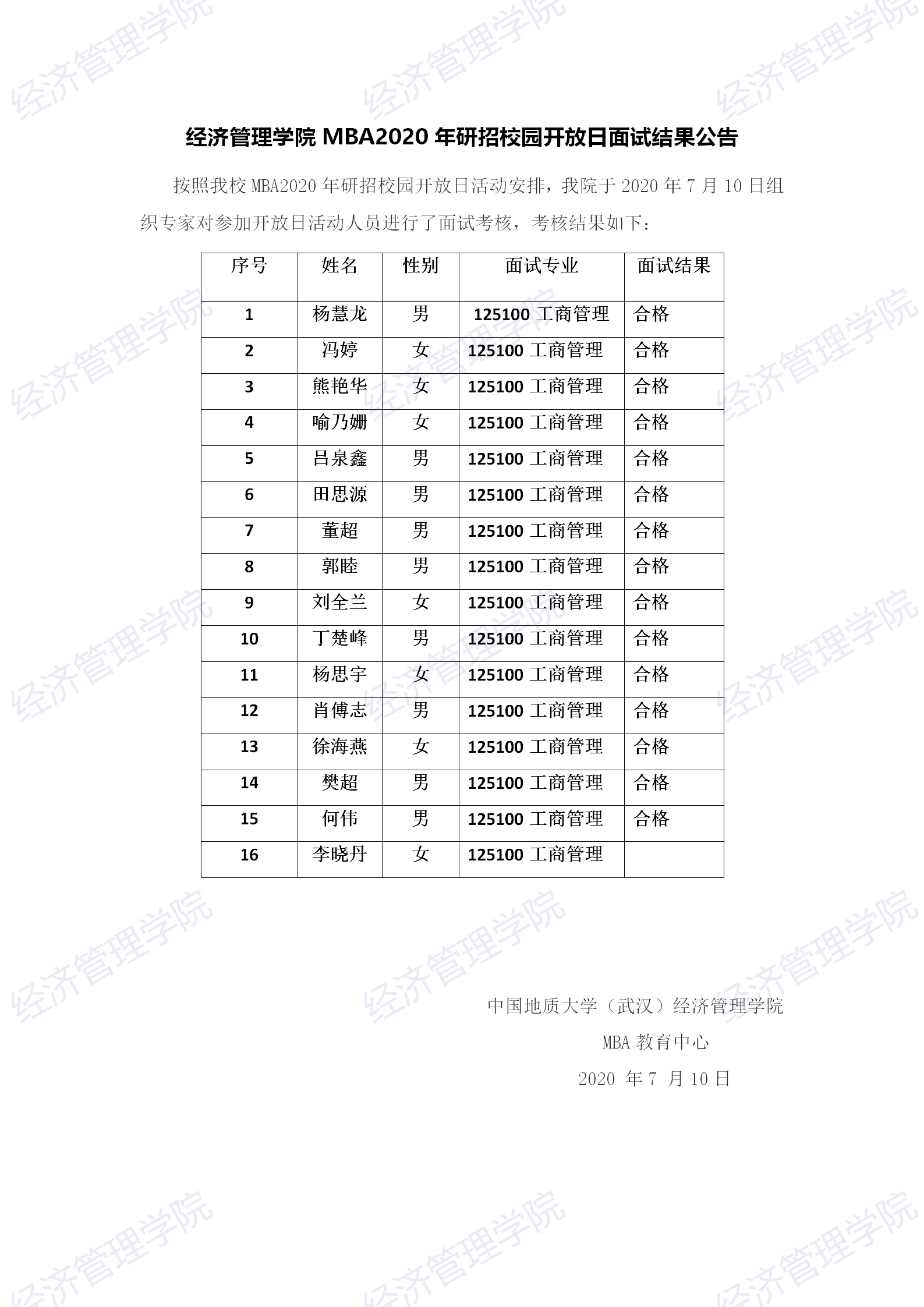 经济管理学院MBA2020年研招校园开放日面试结果公告