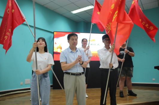 图6:学院党委书记杨昌锐为学生实践团代表授旗