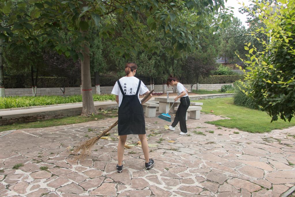 在前两天的学习实践中,队员们注意到有几个园区内的地面上散布着树叶或是游客垃圾,因此在西柏坡的最后一下午队员们对领袖风范雕塑园进行了义务清扫,包括除草、清扫和塑像的擦拭。在志愿服务后,景区焕然一新。挥洒汗水的同时,队员们对雕像背后的故事也有了更多的了解,也更像当地人一样融入西柏坡。