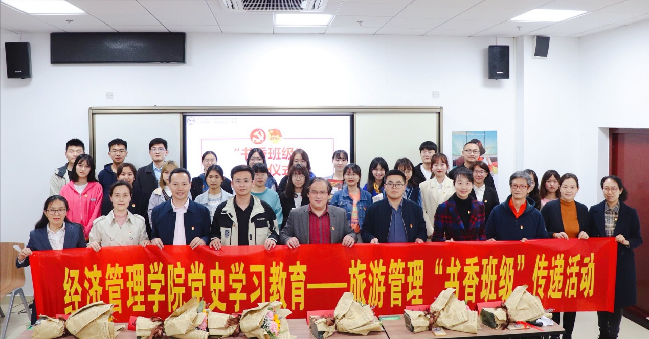 2021年3月30日晚,经济管理学院党史学习教育——旅游管理“书香班级”传递活动在南望山校区东教A0106教室举行。此次活动是在学院党委指导下,由旅游管理系党支部及其“结对领航”的学生班级共同策划组织。校图书馆馆长徐世球、学院党委副书记李少杰、学院辅导员赵家玮出席活动,旅游管理系党支部书记李江敏、旅游管理系主任肖拥军、身兼各班班主任和学务指导的旅游管理系党员教师唐嘉耀、李会琴、梁玥琳、周玲、黄珂,以及旅游管理系党支部“结对领航”的08S207班全体同学、085181班和085191班同学代表参加活动。