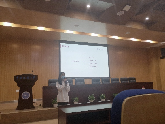 第二环节是主席团成员郑雯琪进行团学组织部门介绍。首先,郑雯琪强调了经管学生会是在经管团委的指导下开展工作,大一年级工作组和学生干部储备班为经管团学组织输送人才。其次,郑雯琪依次介绍了经管团学组织各部门的组织架构和部门职能。最后,郑雯琪建议同学们根据自身竞选意向,结合CUG经管新生代的多彩院会推文来加深对经管团学组织的了解。