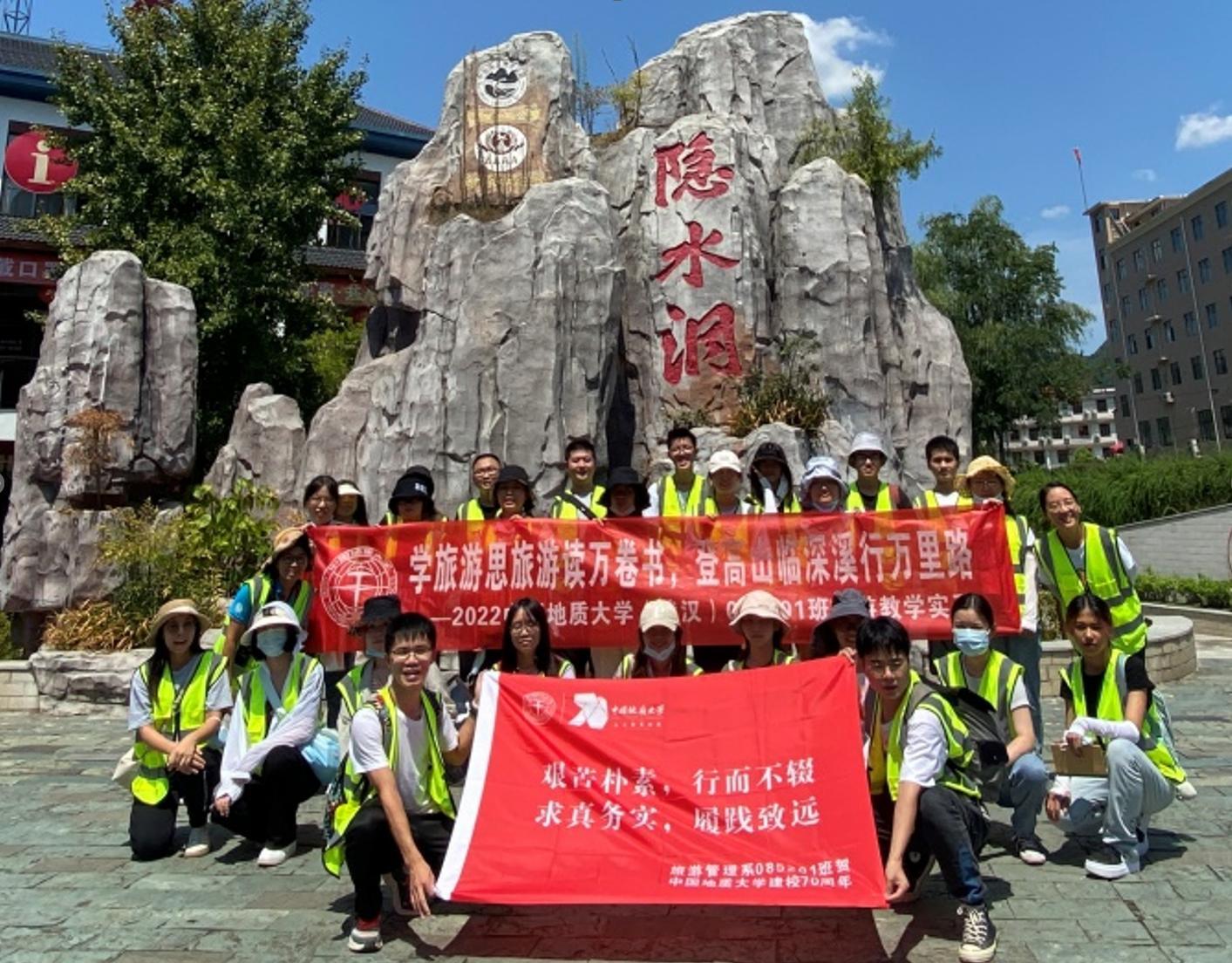 位于地学旅游线上的通山县,其旅游开发对拉动地方经济发展有决定性作用,当地旅游开发建设者同色漫网 (武汉)旅游学人携手开展的地质公园资源勘察、开发规划与公园建设,谱写出共同奋斗、艰苦创业的历史篇章,凝结出旅游“铁人”精神,是认知旅游地学开发、了解旅游扶贫与乡村振兴、认识旅游业及旅游人在社会经济发展中的作用与贡献、学习旅游学人和旅游“铁人”精神的典型案例地,也是旅游管理系党支部开展师生“结对领航”项目的场所之一。本次地学旅游线的实习考察,带队教师联系并邀请到长期参与当地旅游开发建设与管理、通山隐水洞国家地质公园市场部负责人王俊伟经理为同学们做现场教学,在听“旅游故事”中开展了相应思政教学活动。