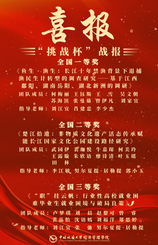 长期以来,经济管理学院高度重视学生创新创业能力发展,通过制定《学生竞赛级别认定办法》《学生学科竞赛活动奖励资助办法》等制度,不断夯实实践育人基础,完善项目培育机制,努力培养学生的创新意识、协作精神和解决实际问题的综合能力。以赛促学、以赛促教、以赛育人,鼓励师生参加各级各类双创竞赛,激励广大青年学生在实践中增长智慧和才干。近年来,学院在全国性学科竞赛、行业类竞赛中屡获佳绩,为建设特色鲜明的高水平研究型学院,实现建成地球科学领域世界一流大学的“地大梦”在不懈奋斗。本次大赛取得的好成绩,是各团队在学校、学院党委领导下,团委指导中,师生齐心协力、积极备赛,将专业理论转化为实际贡献的一个缩影。
