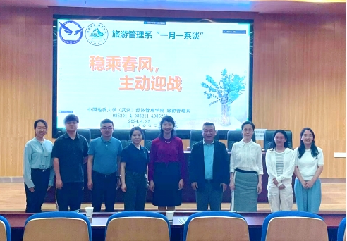 (通讯员:文/黄珂、田林 图/李千惠、刘佳娣)2024年4月22日14点,经济管理学院旅游管理系在未来城校区经管楼一楼报告厅举行了以“稳乘春风,主动迎战”为主题的“一月一系谈”活动。意在坚定学生的专业信念,搭建多渠道校企合作桥梁。特别邀请上海亚湾酒店管理有限公司、华住集团、湖北天屿湖生态文旅有限公司的领导嘉宾。学院学生工作组蔡杨老师、旅游管理系教师、旅游管理专业2020、2021、2022级学生参加了会议。
