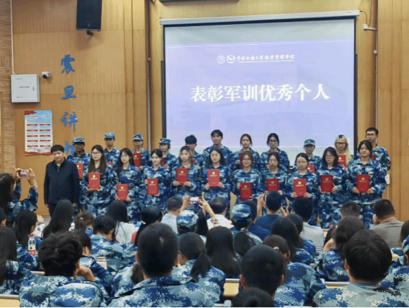 大会对军训期间表现优异的个人进行了表彰。副院长肖建忠、王广民为“军训优秀个人”颁发荣誉证书。在为期两周的军事训练中,男生军体拳虎虎生风,女生匕首操英姿飒爽,展现了经济管理学院2025级新生的良好精神风貌。