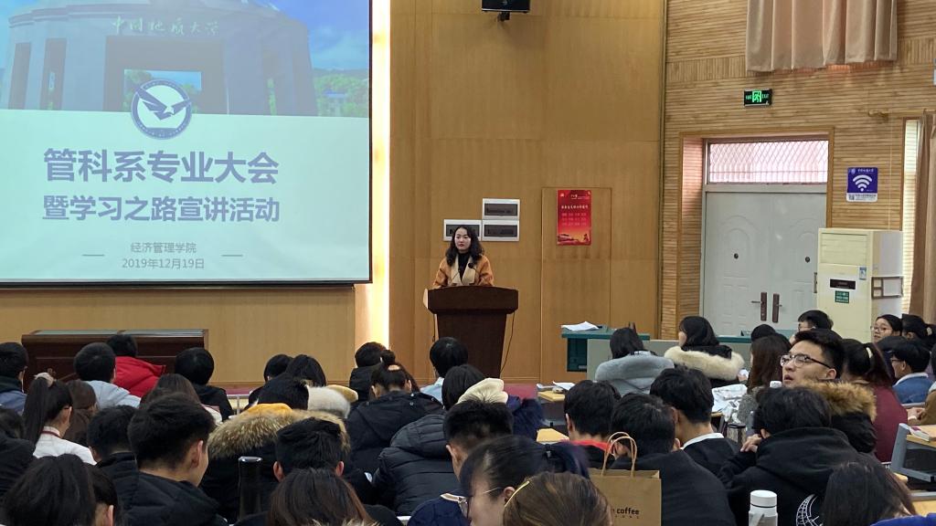 2019年12月19日,经济管理学院管理科学与工程系本科生专业大会暨学习之路宣讲活动在教三楼109召开,管科系副主任翁克瑞老师、管科系辅导员徐媛老师出席大会,17-19级管科系全体学生参会,会议由徐老师主持。
