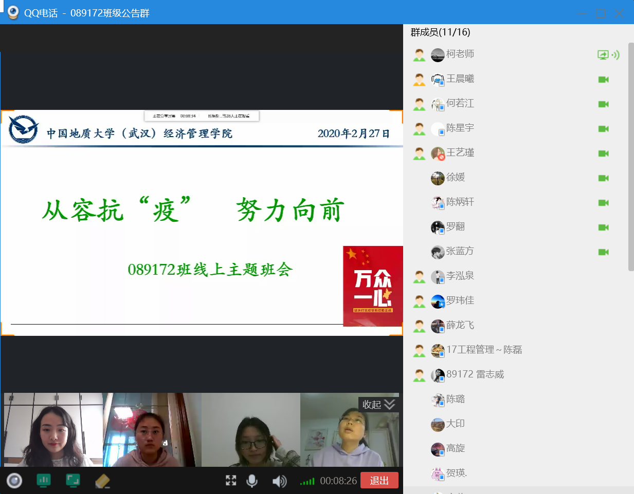 “大三下学期是同学们的大学规划能否实现的关键学期。我作为班主任最关心的学生们因为疫情隔离在家的日子里,生活上是否有困难,学习上是否有困惑。”基于这种想法,柯小玲与徐媛老师将此次班会的主题确定为“从容抗‘疫’,努力向前”,希望通过此次班会引导学生们坚定必胜信心,做好学业规划,确保计划落实。