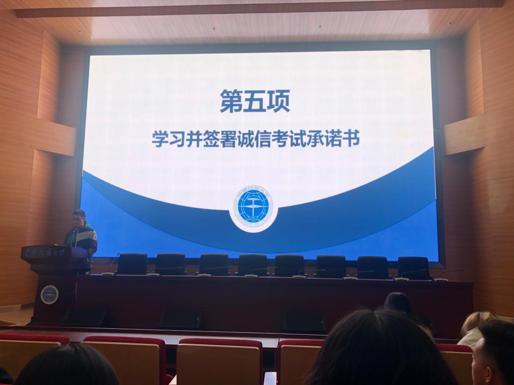 活动的第二项议题是考风考纪诚信教育。努尔老师首先带领同学们学习了《中华人民共和国刑法(修正案九)》中有关考试作弊的规定,呼吁同学们增强守法懂法意识。其次结合色漫网 《色漫网 (武汉)本科课程考核违规处理办法》宣读了违纪行为的认定与处理等相关规定,要求同学们诚信参加任何考试。紧接着,082182班黄浩同学作为学生代表,带领同学们学习《诚信考试承诺书》内容,全体同学签字承诺自觉遵守考核纪律。