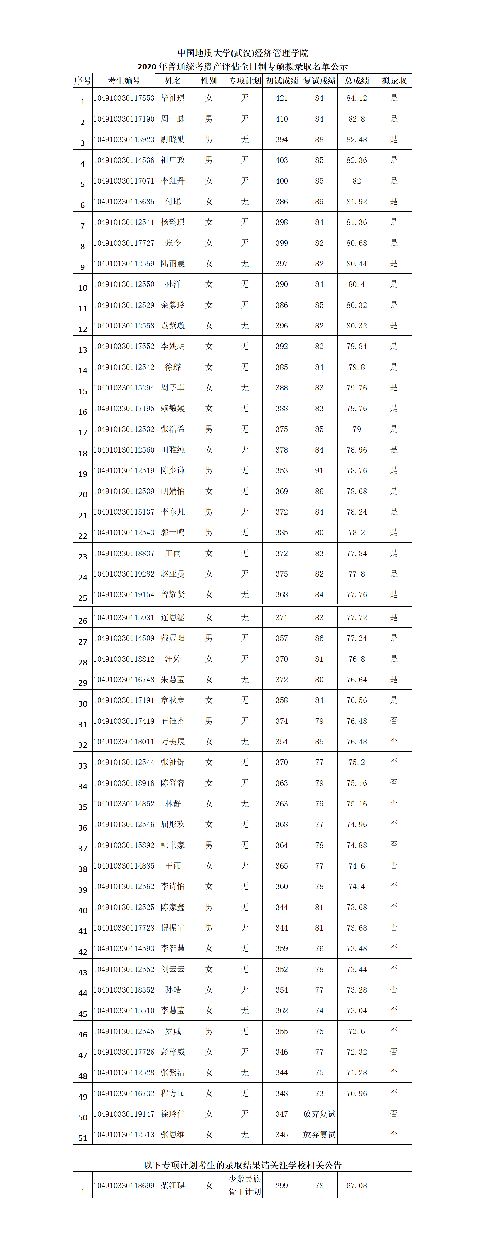 2020年普通统考资产评估全日制专硕拟录取名单公示