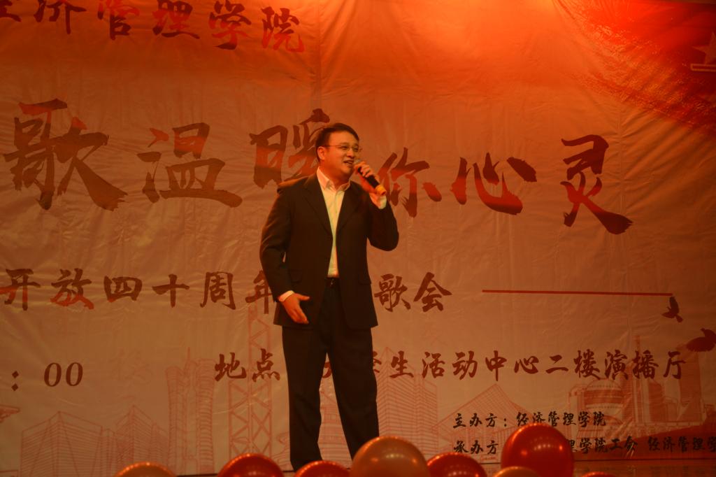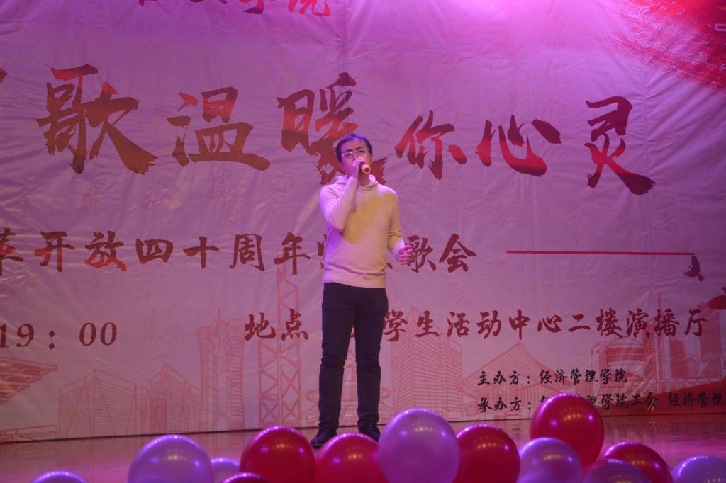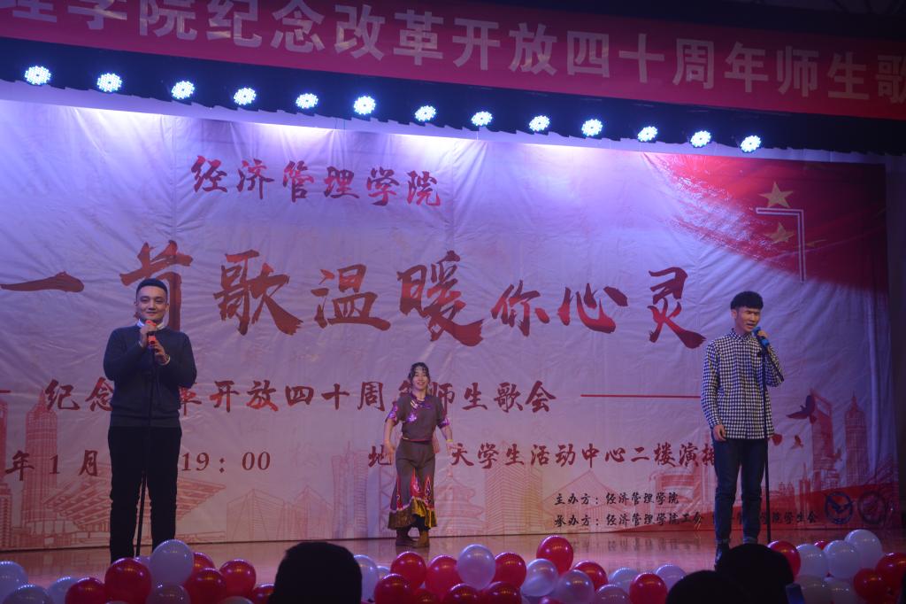 (通讯员:学生曹银凤)2019年1月3日晚7:00,大学生活动中心二楼演播厅灯火辉煌。为纪念改革开放四十周年,经济管理学院举办“总有一首歌温暖你灵”师生歌会。学院党委书记杨昌锐,院长杨树旺,党委副书记沈波,副院长肖建忠,副院长於世为,各系主任、教师,各年级辅导员出席歌会,全体本、研学生到场观看。
